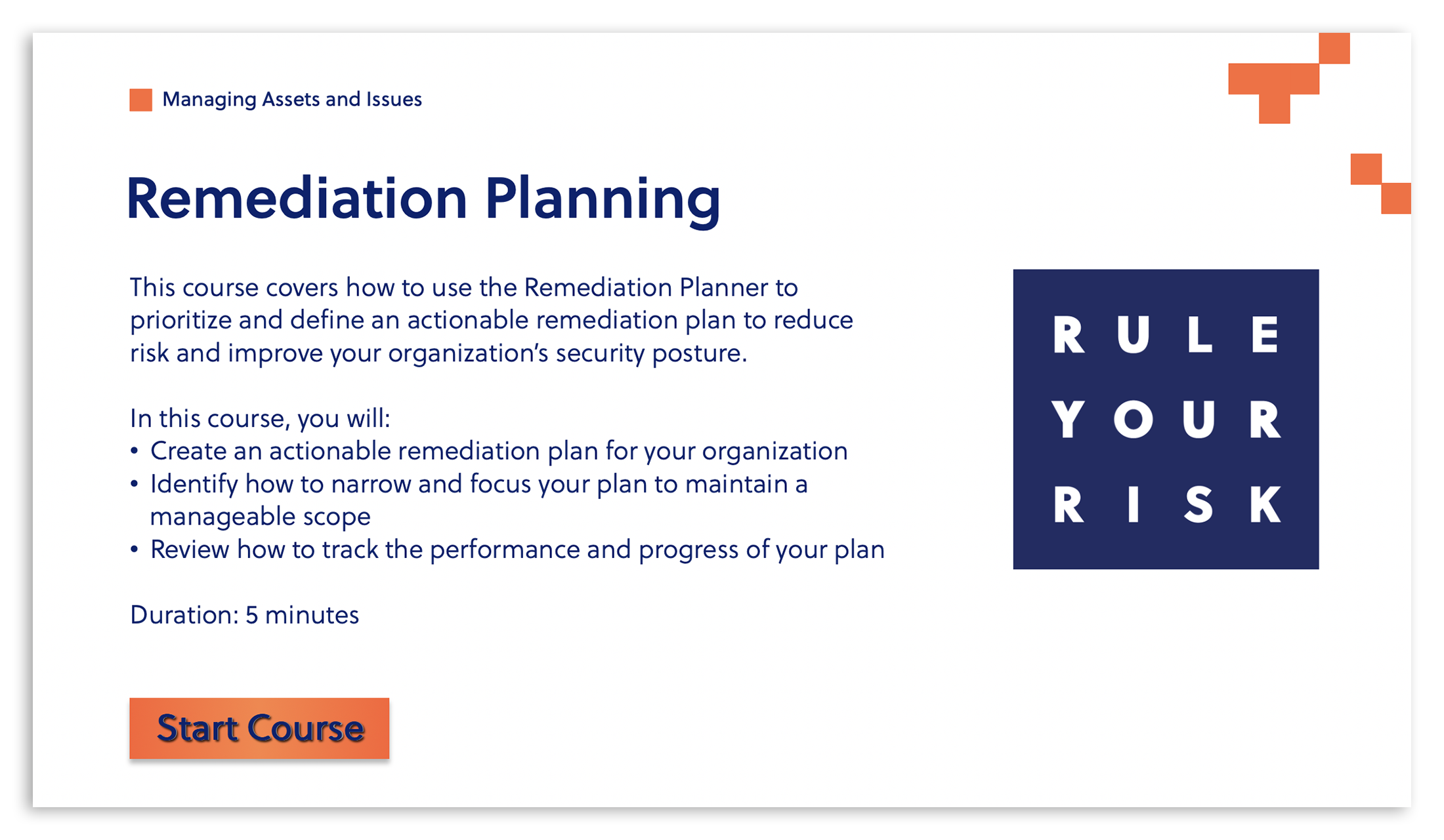The Introduction course is the first course in the Getting Started path, and the Remediation Planning course is one of the Managing Assets and Issues courses.